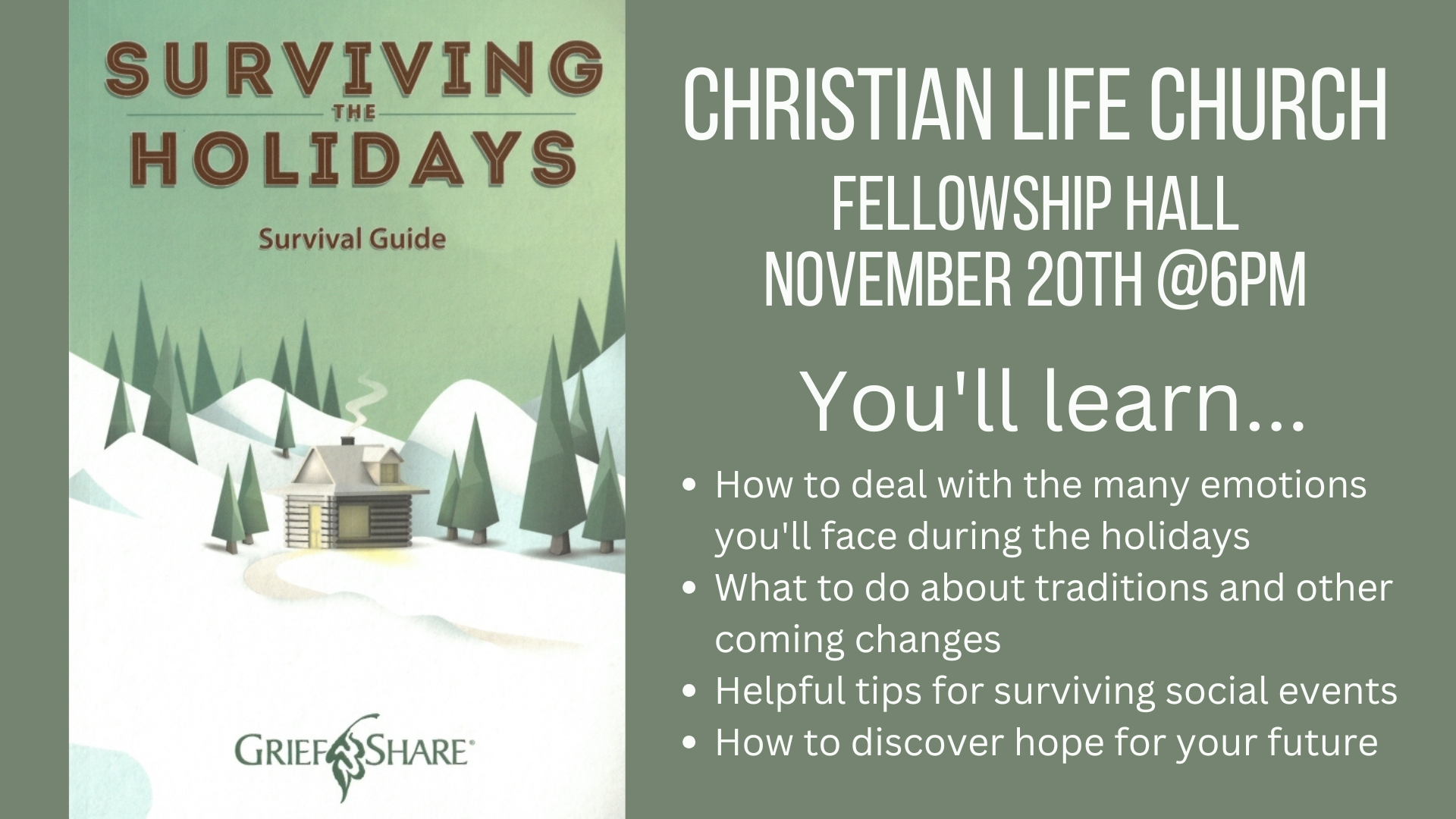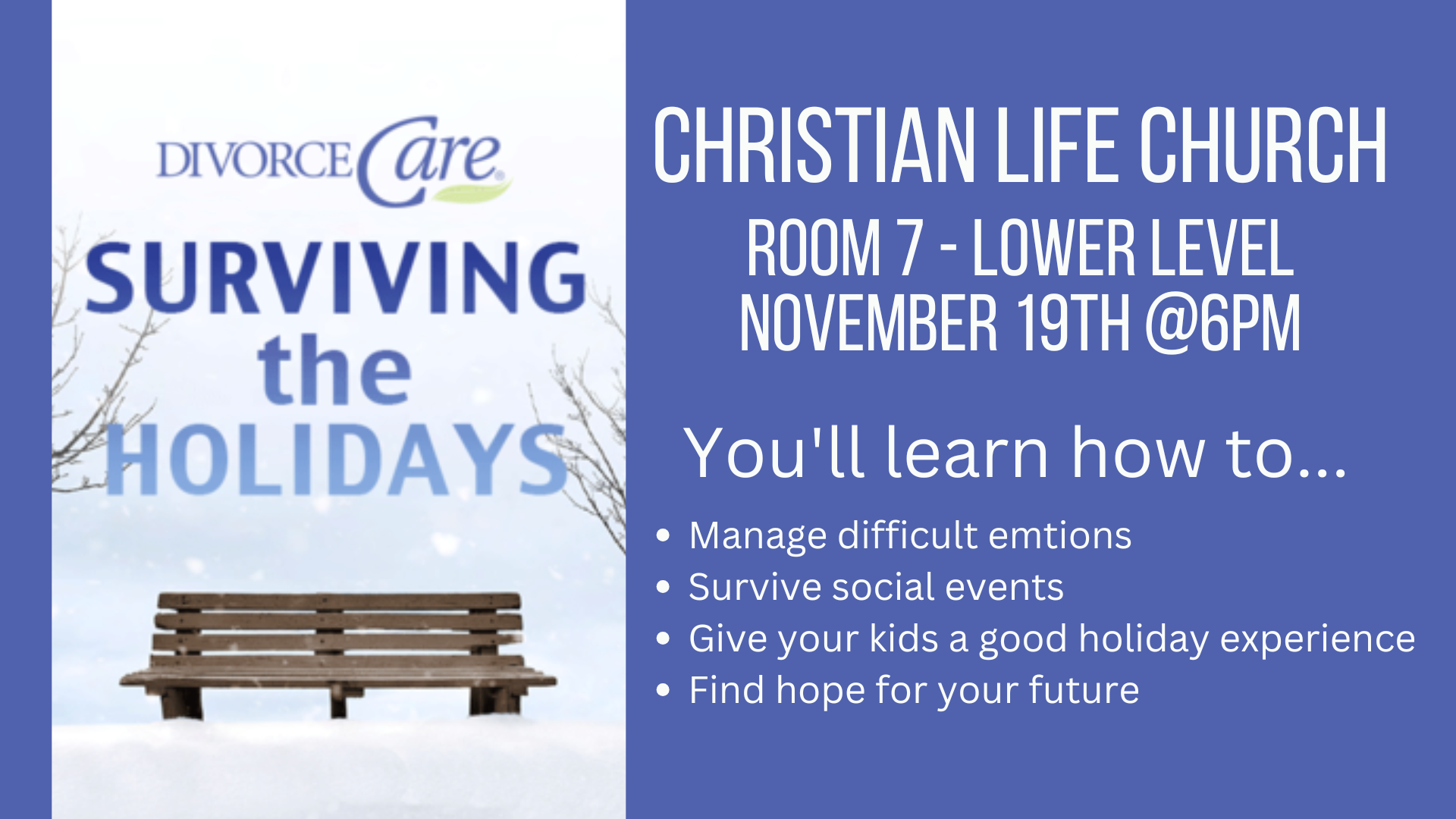Gather with others who are going through the grieving process. You'll learn how to deal with the many emotions you'll face during the holidays. What to do about traditions and other coming changes. You'll also learn helpful tips for surviving social events and discover hope for your future.