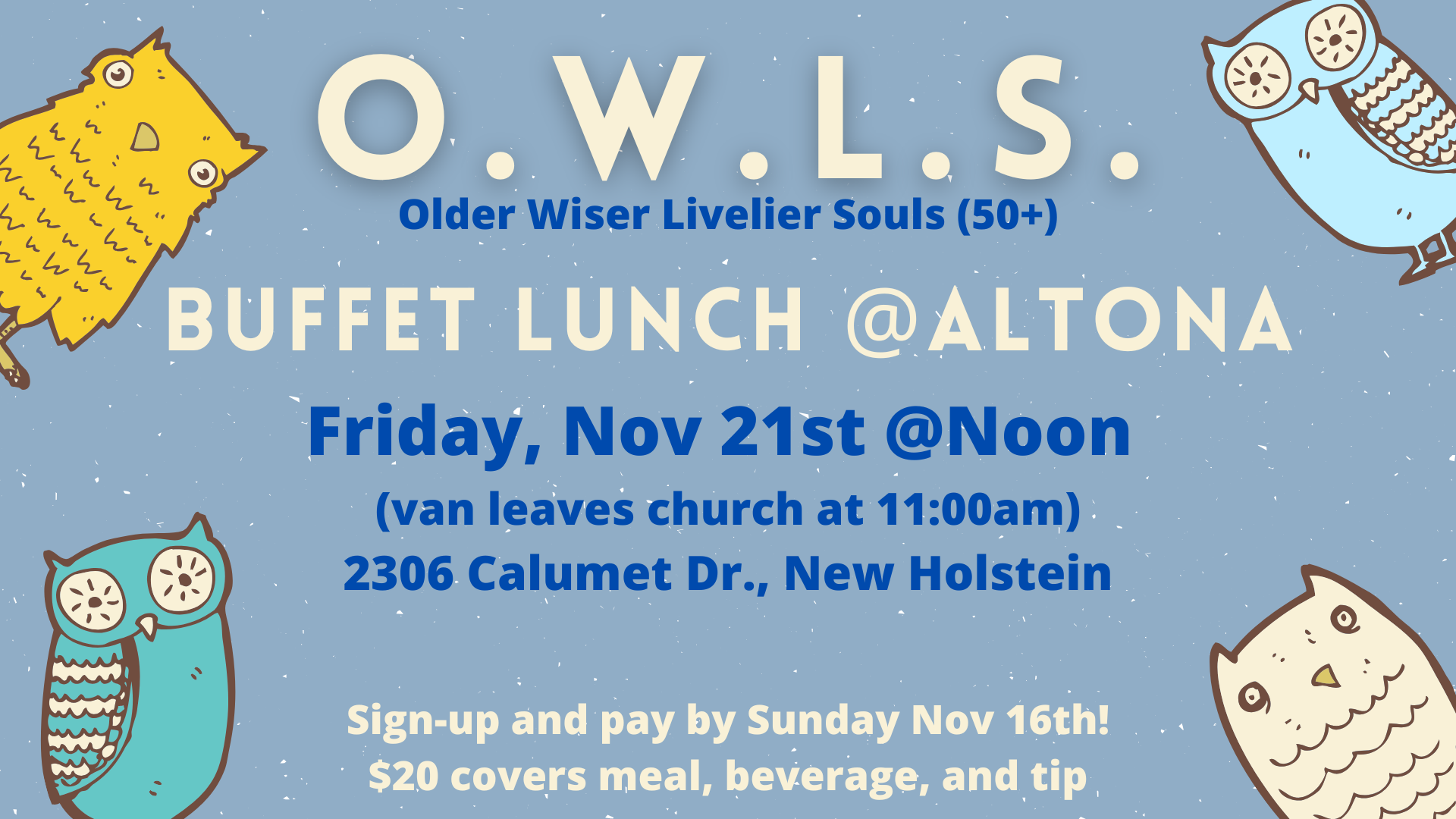 The OWLS are heading to Altona in New Holstein for a Buffet Lunch. Altona agreed to keep the price to $20 each! This covers your meal, a beverage, and the tip!
