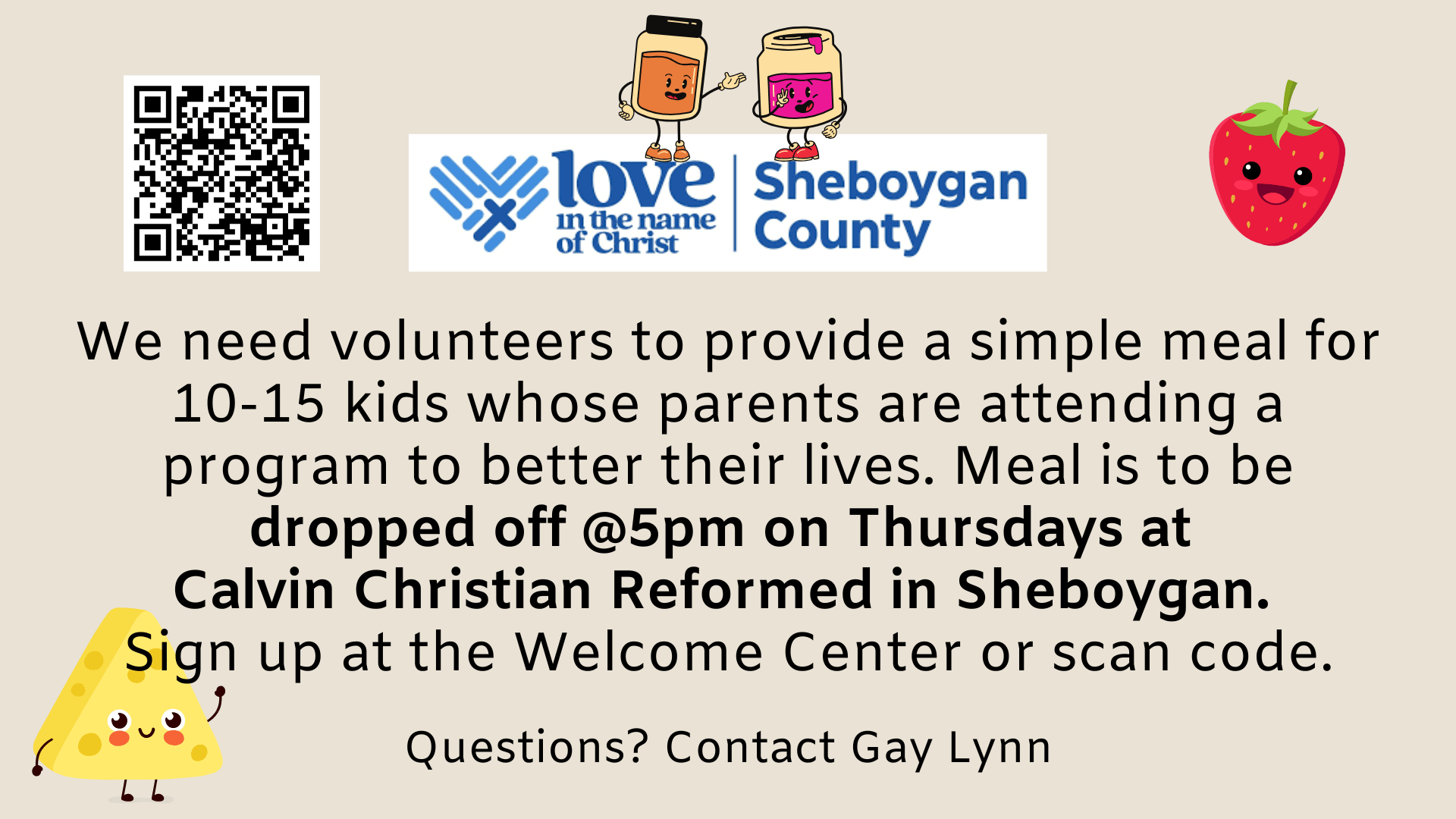 We have partnered with Love INC Sheboygan County to provide 10-15 kids a meal on Thursday nights while their parents attend the NEW WAY Classes, which empower them to improve their lives. The meals need to be delivered to Calvin Christian Reformed Church in Sheboygan at 5pm in the church nursery.